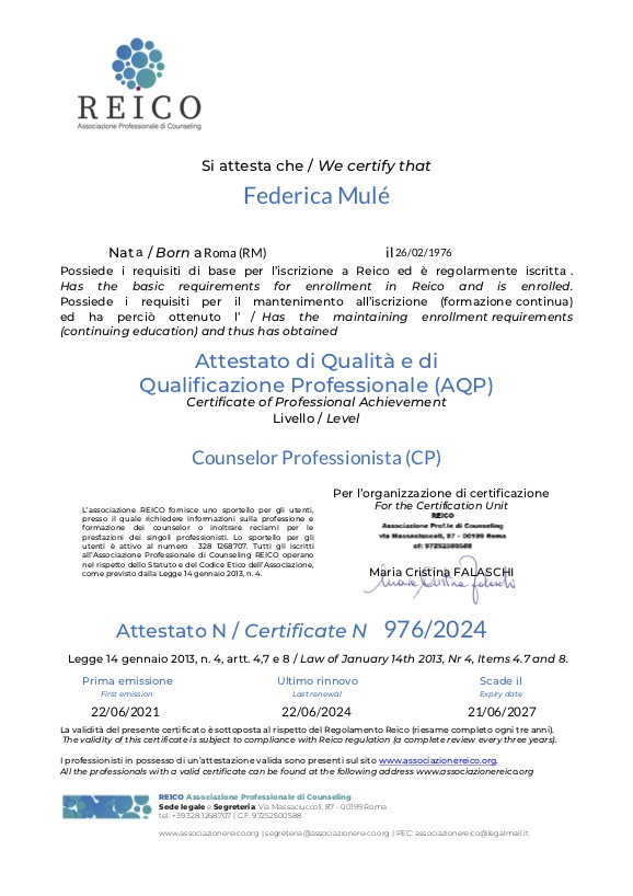 Il mio percorso formativo nasce dal desiderio di approfondire la relazione di aiuto e di sviluppare competenze di ascolto e accompagnamento della persona. La formazione in counseling mi ha permesso di integrare strumenti di dialogo, presenza e consapevolezza utili a sostenere le persone nei momenti di cambiamento o difficoltà.